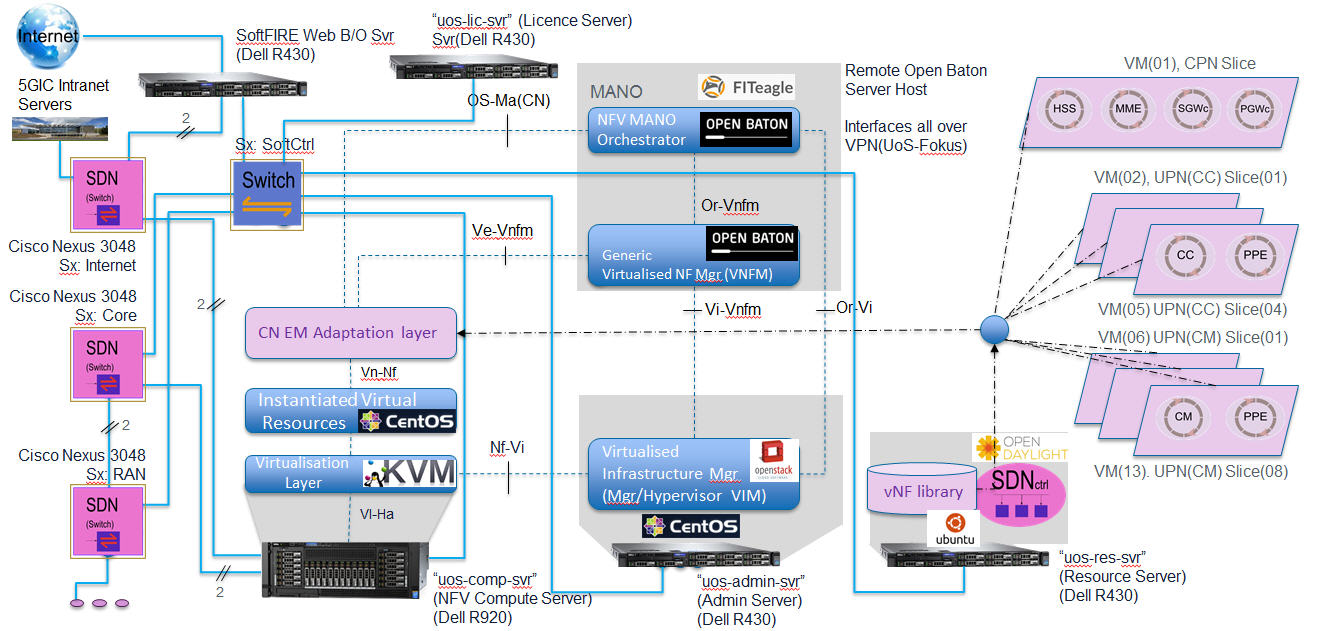 The 5GIC Test-bed Component Summary The UoS SoftFIRE testbed segment is part of the overall UoS 5GIC testbed. Located in the UK, the scope of the lab scope is to provide hands-on access to a 3GPP based campus RAN with indoor and outdoor coverage that is able to be inter-connected with a variety of virtualized core slices, in order to develop Core Network 5G evolutions and demonstrate 5G Use Cases running over the resultant ETE cellular network. In this manner the testbed can be used to build industry core competence in 5G. It is envisaged that experimenters using the facilities of the UoS SoftFIRE testbed will be able to show specific and concrete “proof” points related to the 5G RAN and Core evolutions and demonstrate applications running over this infrastructure. Experimenter Activities supported 1. Standard experimenter Demo 2. Deep Dive on experimenter specific request 3. PoC whilst connected to experimenters equipment or remote site 4. Validation and Certification on Customer specific solution The UoS testbed is a flexible environment where it is possible to combine different RAN hardware configurations and RAN and Core software configurations to support different delivery designs and policies. There is also scope to evolve the testbed in cooperation with a given experimenter and/or customer. ETE Architecture The Architecture of the testbed is as listed below: OpenStack(Liberty) NFV controller system access to infrastructure that can be used to instantiate core slices for experimentation with the local RAN components that are connected using an OpenDaylight(Beryllium) SDN controller that manages the SDN switches at the edge of the RAN. Access to a segment of the 5GIC Testbed outdoor campus based LTE-A RAN Access to the 5GIC in-building LTE-A RAN Access to the 5GIC in-building Wi-Fi system for multi-access 5G use cases RAN Capabilities The RAN capabilities of the testbed are illustrated in the table below, these resources are fixed but able to be conmnected to any of the network slices instantated by the network. Network Architecture The network architecture of the testbed includes an ‘admin’ server which runs the NFV OpenStack controller for core network VNF and application instantiation a ‘compute’ server onto which the VNFs are instantiated and a ‘resource’ server which hosts the images, packages and network services which are tyo be instantiated. The transmission is provided by a set of SDN switches which interconnect the RAN and core components whos flows are controlled by an Open Daylight controller mounted on the resource server. Provided Network Services The testbed supports the following base Network Services Network Service Max # of instances on the UoS Testbed vNF’s included in Network Service Description CPN 1 HSS, MME, integrated(SGWc, PGWc) This Network Service (NS) slice is instantiated as soon as any EPC is required to be instantiated on the UoS testbed for Control Plane connectivity via the UoS LTE-A RAN. There is only ever one instance of the CPN NS for the whole UoS SoftFIRE network Segment. UPN(CC) 4 CC, integrated(SGWu, PGWu) This Network Service is instantiated per experimenter for LTE User Plane service and extended 5G Context Awareness Association to a group of cells known as a “Cluster” via the newly proposed 5G node called a Cluster Controller (CC). This slice provides best performance for Internet access. Each authorized experimenter is enabled for instantiation of one of these NS, network slices on the UoS testbed. UPN(CM) 8 CM, integrated(SGWu, PGWu) = a.k.a. “PPE” This Network Service is instantiated per experimenter for LTE User Plane service and extended 5G Context Awareness Association to a Cluster Member within a “Cluster” via the newly proposed 5G node called a Cluster Member (CC).This slice provides best performance for Intranet access via one of the Cluster Members. Access to a local server instance that the experimenter may wish to deploy at the edge of the LTE-A network for optimum latency performance is enabled with instantiation of this slice. Otherwise, the experimenter would need to deploy their test network server application north of the PGWu which is less optimal for test server access from the User Equipment (UE, Mobile). Each authorized Experimenter is enabled for instantiation of up to two of these NS, network slices on the UoS testbed. Provided Intranet Test Services The testbed supports the following intranet connectivity services: Intranet Web pages, Intranet Video Content and Intranet served Applications. Mobile Device Support In order to test locally on the testbed the following mobile device considerations should be noted: Aspect Specification Comment OS Android Lollipop 5.x.x preferred Easier to develop research code with more parameters exposed than iOS LTE Bands B38, B41 These bands are essential for outdoor and indoor operation at UoS. Wi-Fi 802.11ac The UoS has 802.11ac and most previous generations of Wi-Fi support Category 5,6 A minimum of category 5 is essential to support the Carrier Aggregated LTE-A RAN in order to get the best speeds from the deployed RAN. For further information on the 5GIC testbed segment please contact the following key contacts: Aspect Contact System g.foster@surrey.ac.uk IT/Enterprise chris.clark@surrey.ac.uk RAN f.emntezami@surrey.ac.uk